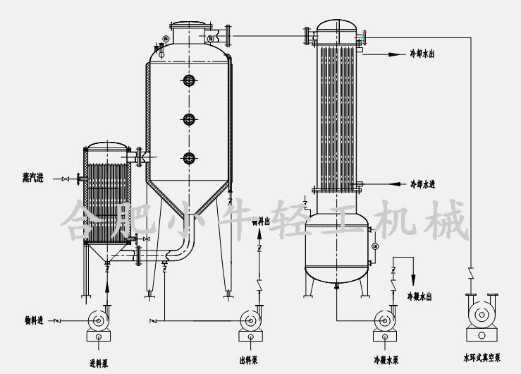單效外循環(huán)蒸發(fā)器(單效濃縮器)在工作時(shí),濃度較低的稀料液由進(jìn)料泵或利用真空自吸的方法進(jìn)入加熱器的管程,鍋爐高溫蒸汽進(jìn)入加熱器的殼程,蒸汽對(duì)管程內(nèi)的料液間接性加熱,料液受熱后沸騰,液面上升,從噴射管?chē)娙敕蛛x器,進(jìn)行閃蒸,在分離器內(nèi),比重較重的料液下降至底部,經(jīng)循環(huán)管回到加熱器再次受熱,受熱后再次沸騰噴入分離器,以此形成循環(huán),而比重較輕的二次蒸汽上升至頂部,經(jīng)二次蒸汽管路進(jìn)入列管式冷凝器殼程,被冷凝器管程內(nèi)的冷卻水冷凝成液相后進(jìn)入冷凝水收集罐,最后由泵排出,以便回收利用或另行處理,一部分不凝氣體由真空泵抽走排出,當(dāng)料液濃縮到一定的程度,經(jīng)取樣確定合格后即可出料,至此完成蒸發(fā)濃縮的過(guò)程。