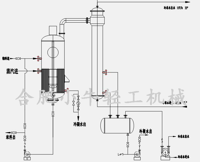 中央循環(huán)管式蒸發(fā)器在蒸發(fā)室外壁有視鏡、人孔、儀表、取樣等裝置。在頂部有捕集器裝置,主要使二次蒸汽可能夾帶的汁液進行分離,保證二次蒸汽的潔凈,有利于提高次一效濃縮鍋的傳熱效果,也減少料液的損失,頂部與二次蒸汽排出管相連。